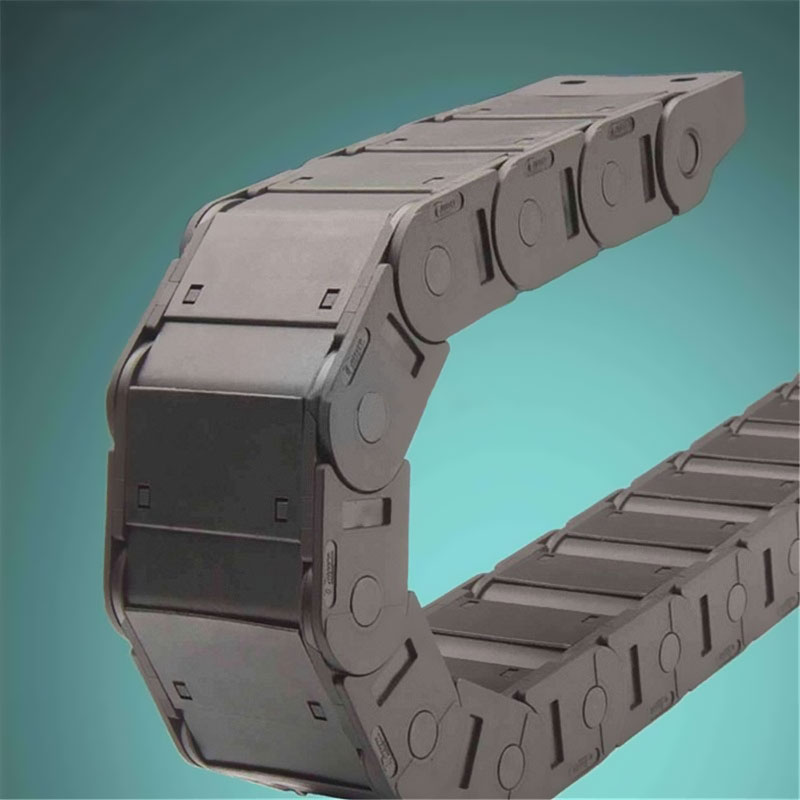 (3)單元鏈節(jié)由左右鏈板和上下檔板(橋式)或蓋板(全封閉式)組成,拖鏈每節(jié)都能打開,裝拆方便,不必穿線,打開蓋板后即可把電纜、油管、氣管、水管等放入拖鏈。